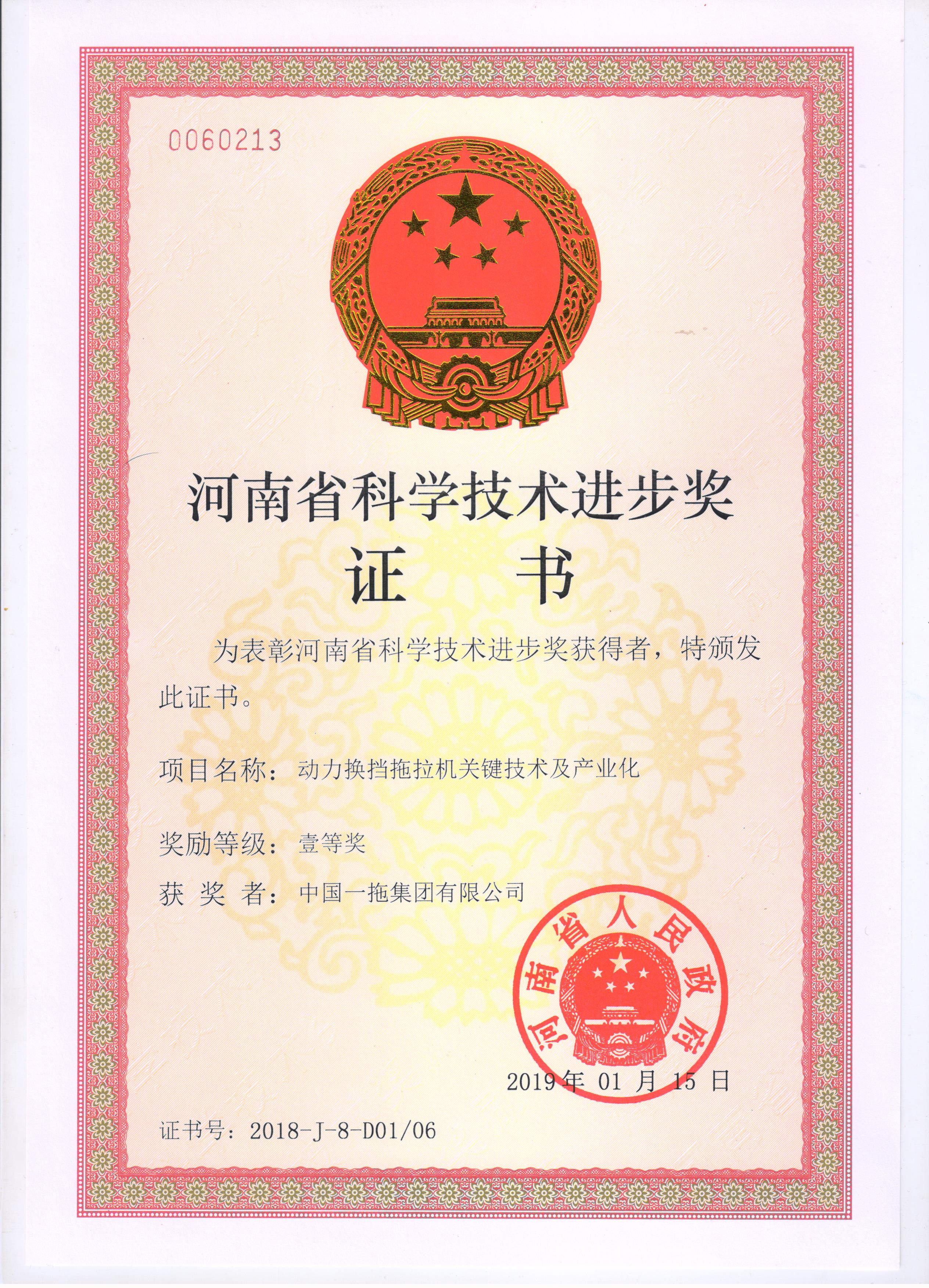 中國一拖獲得2018年度河南省科技進(jìn)步獎(jiǎng)一等獎(jiǎng)證書